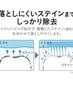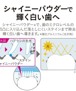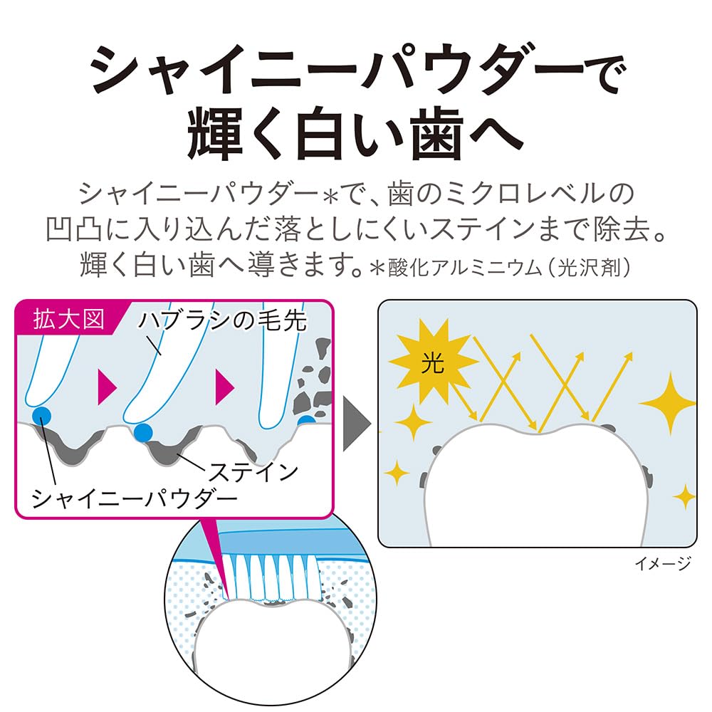●イオンクレンジング処方で、蓄積したステインを浮かせて落としやすくします。さらにシャイニーパウダー(酸化アルミニウム)が歯のミクロの凹凸に入り込んだ落としにくいステインまで除去し、ツルツルで輝く白い歯へ導きます。